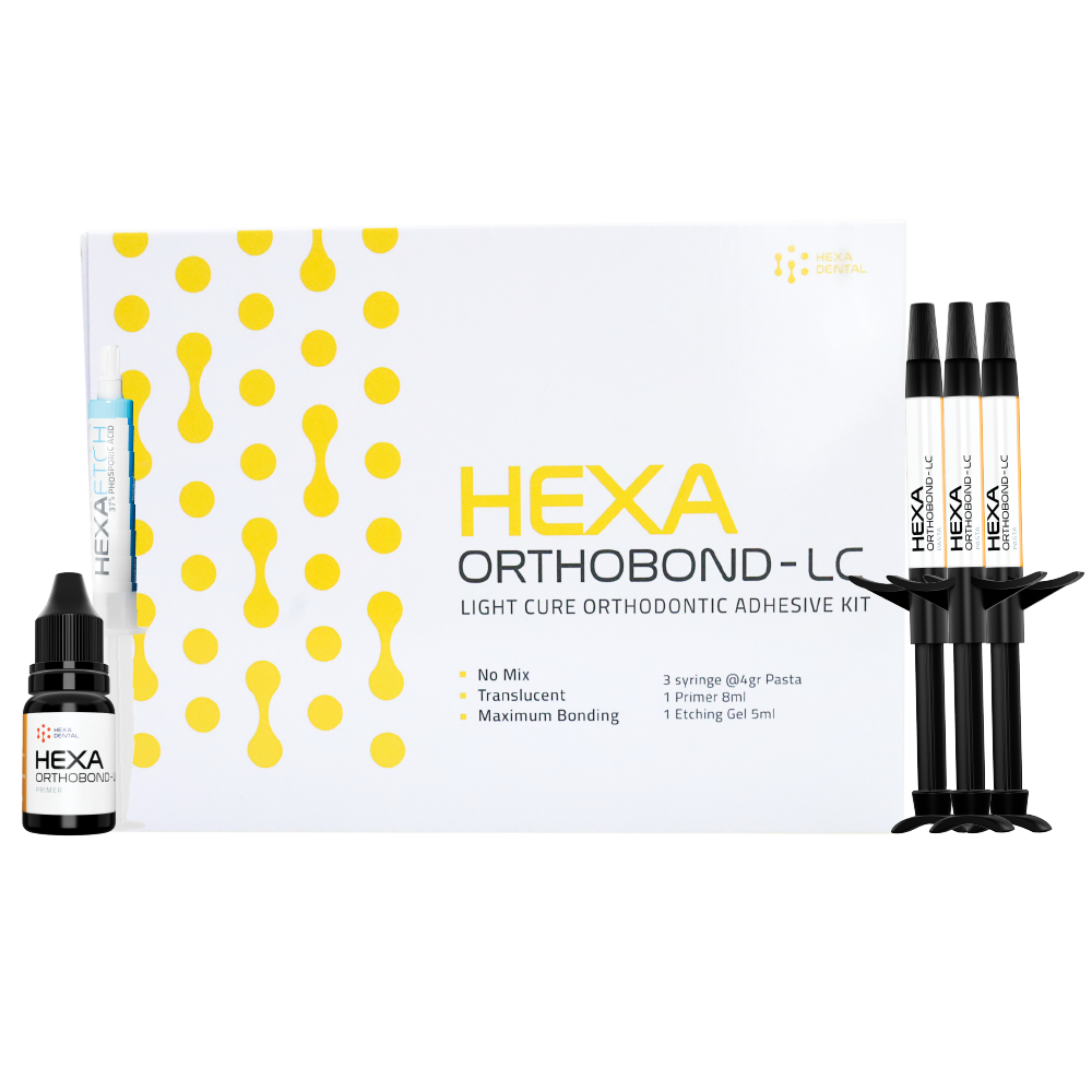 Orthodontic adhesive for orthodontic applications (braces), available in a kit consisting of paste, primer, and etchant. Strong and long-lasting adhesion, a translucent finish after light curing, resulting in a highly aesthetic bond. Medium-flow viscosity keeps brackets in place, and a short curing time.